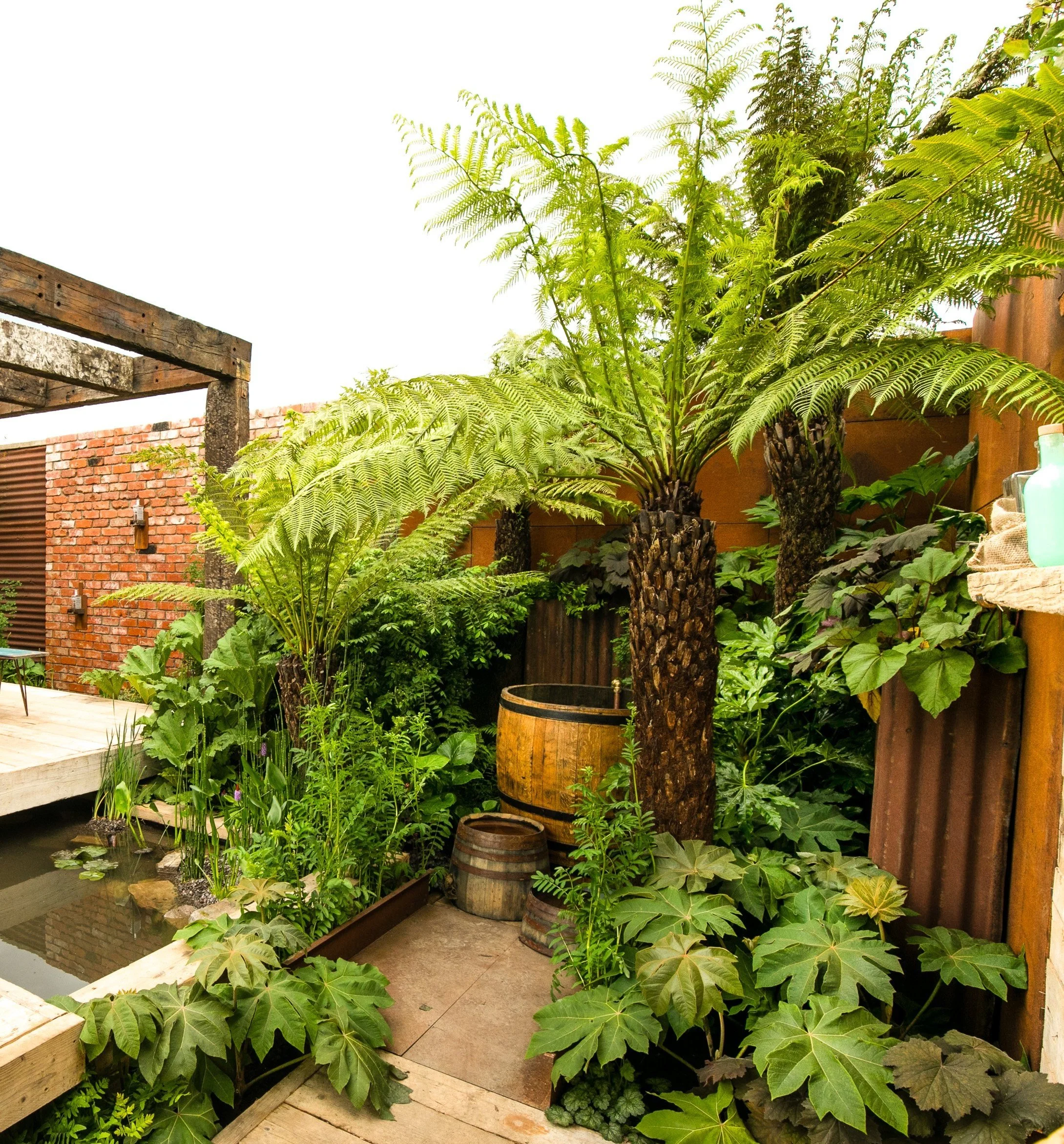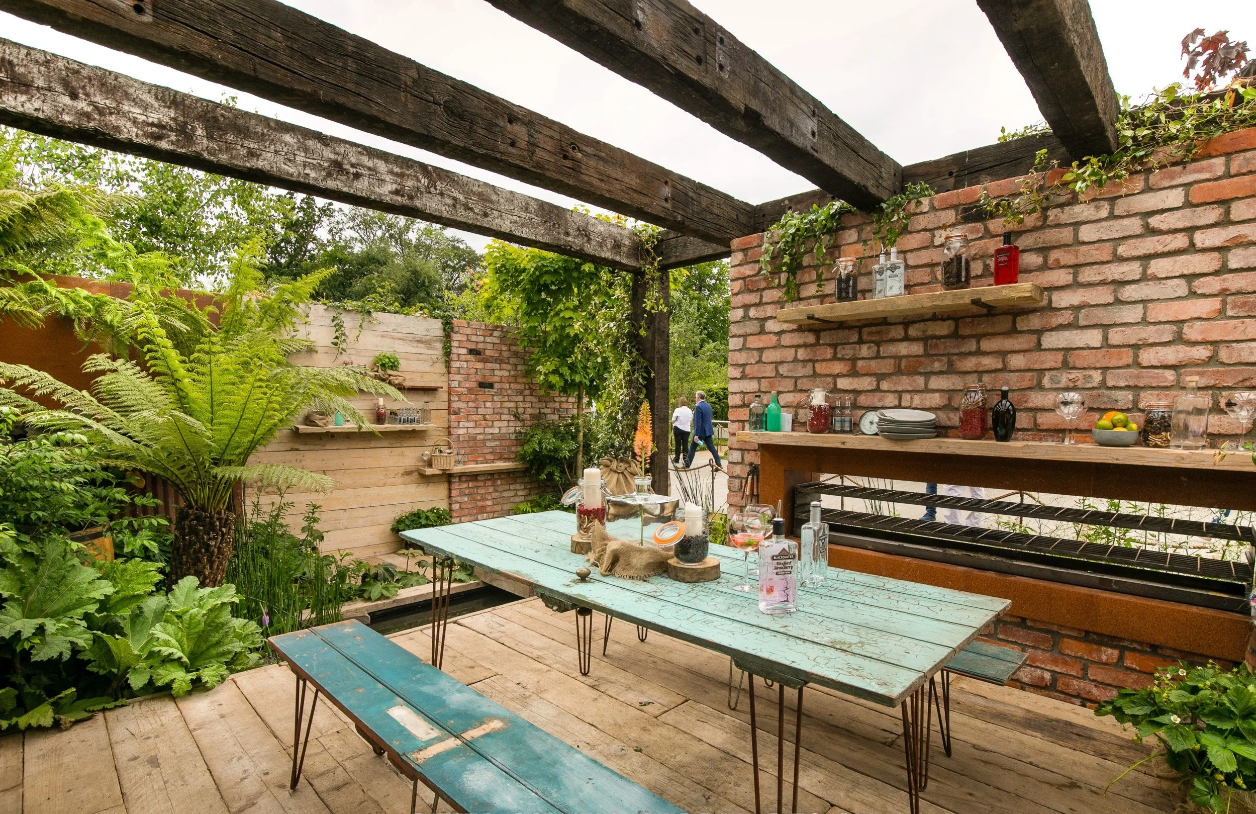 The main dining space featured a reclaimed brick fireplace/bbq under the canopy of reclaimed sleepers. All of these areas were surrounded by water features and dense lush planting. Materials again were heavily upcycled, comprising of steel, scaffold boards, brick and ofcourse the whisky barrel. Awarded a gold medal and featuring on plenty of prime time media, this was a show garden to remember!